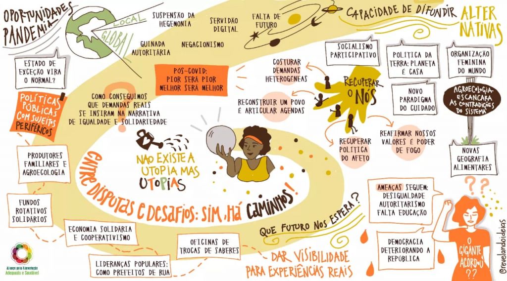 Outro ponto alto foi a mesa “Entre disputas e desafios: sim, há caminhos”, com Jorge Romano e Cleberson Pereira, que abordou as oportunidades e reflexões proporcionadas pela pandemia. O debate levantou eixos de ação para o futuro, como a difusão de pensamentos alternativos que propõem mudanças nos sistemas alimentares que vêm sendo impostos à população, bem como dar visibilidade às experiências reais que concretizam essas concepções sustentáveis e inclusivas. O debate contou com facilitação gráfica (abaixo) da ilustradora Heloísa Ribeiro.