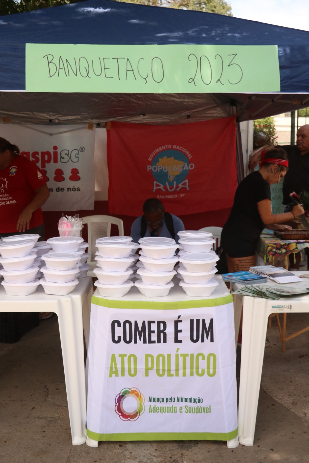 Em Florianópolis, as ações do Banquetaço aconteceram em frente ao Restaurante Popular, no Centro da cidade. Além da distribuição de refeições feitas pela Casa dos Amigos e @coletivobuva, teve microfone aberto, pelo qual ecoaram demandas pelo acesso pleno à água potável, por políticas públicas efetivas na garantia da alimentação adequada, pelo apoio da prefeitura às cozinhas comunitárias e por mais restaurantes populares descentralizados pela capital catarinense. O Cepagro, membro da Aliança, participou da construção do evento ao lado de diversos movimentos sociais e organizações.