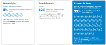 Com uma navegação simples e intuitiva, o Panorama da Obesidade em Crianças e Adolescentes permite visualizar e interagir com os dados. É possível encontrar valores absolutos de magreza, magreza acentuada, peso adequado, risco de sobrepeso, sobrepeso e obesidade em nível local e estadual, em todos os 27 estados e 5.570 municípios do Brasil.