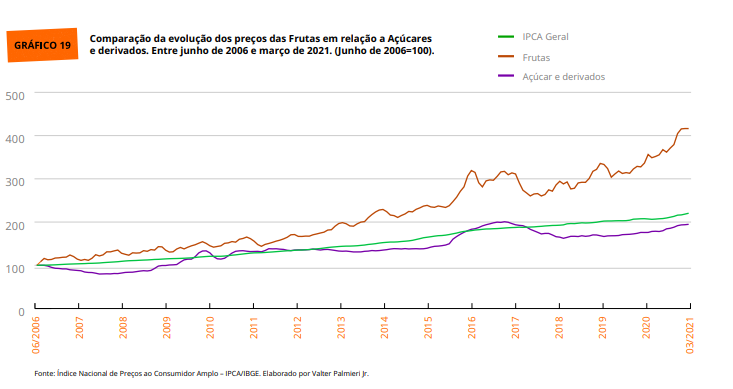 De acordo com o estudo, os alimentos mais saudáveis apresentam, desde 2006, uma elevação de preço superior à média dos alimentos e muito acima dos produtos ultraprocessados. Um exemplo é a comparação do preço entre frutas e refrigerantes. Desde junho de 2006 até março de 2021, a inflação das frutas, por exemplo, foi 89% maior do que o IPCA e 114% maior do que “açúcares e derivados”. Os refrigerantes também apresentaram oscilação de preço muito inferior aos das frutas, tornando-se relativamente 43% mais baratos em 2021 em relação a 2006.