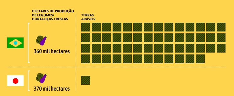 Outro destaque da apresentação – que contou com design gráfico da Fábrica de Ideias Brasileiras – são dados a respeito da produção de legumes, verduras e frutas em comparação à produção de commodities. Um dos dados do relatório mostra que o total de hectares destinados à produção de legumes pelo Brasil é menor do que o do Japão – ainda que a quantidade de terras agricultáveis brasileira seja 54 vezes maior do que no país asiático.